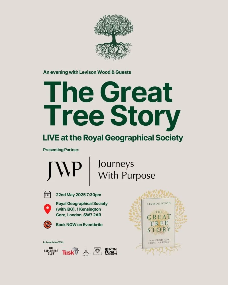 Every ticket includes a signed copy of Levison Wood’s new book, The Great Tree Story (RRP £25), plus the chance to win exclusive prizes from brands including Scientific Exploration Society, Shackleton, Tentsile, Iron Raft, and Journeys With Purpose.